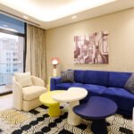 The suite features a separate bedroom and a spacious living room, a flat screen TV with cable channels, complemented by city views and a private balcony. A fully equipped kitchen includes a stovetop, refrigerator, dishwasher, washing machine, complete kitchenware and tea and coffee making facilities. The elegant bathroom offers a walk in shower and complimentary toiletries. Additional amenities include air conditioning, complimentary WiFi and soundproofing, ideal for both short and extended stays.